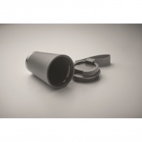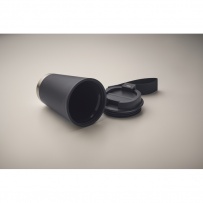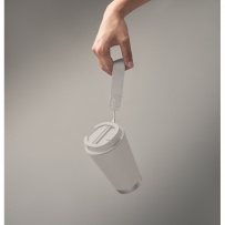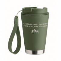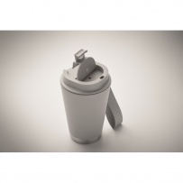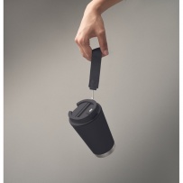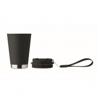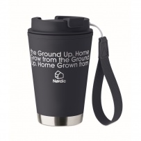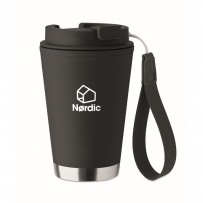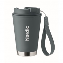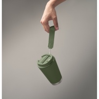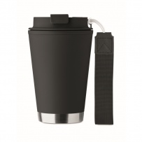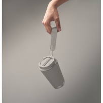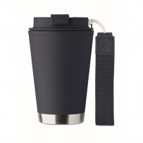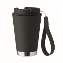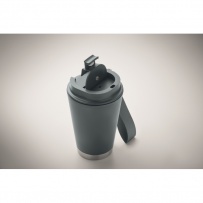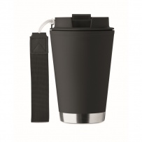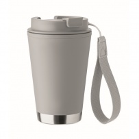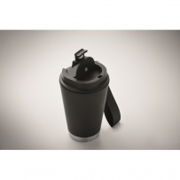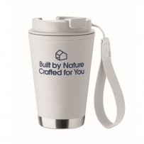 Doppelwandiger Becher mit Innenseite aus PP, Außenseite aus recyceltem PP, Details aus recyceltem Edelstahl. RPET-Handschlaufe. Füllmenge: 300 ml.