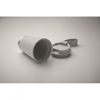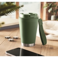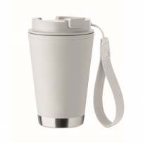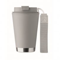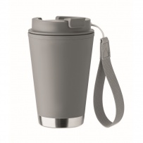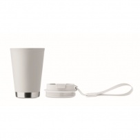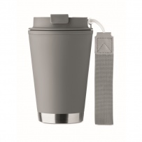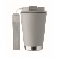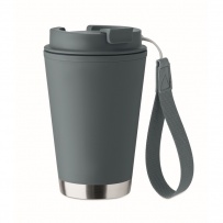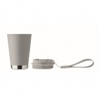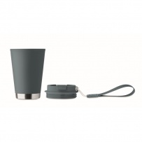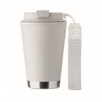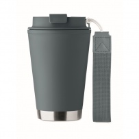 Double wall tumbler in PP inner wall, recycled PP outside wall, recycled stainless steel detail and RPET wrist strap. Capacity: 300 ml.