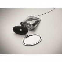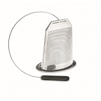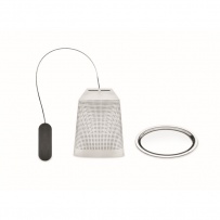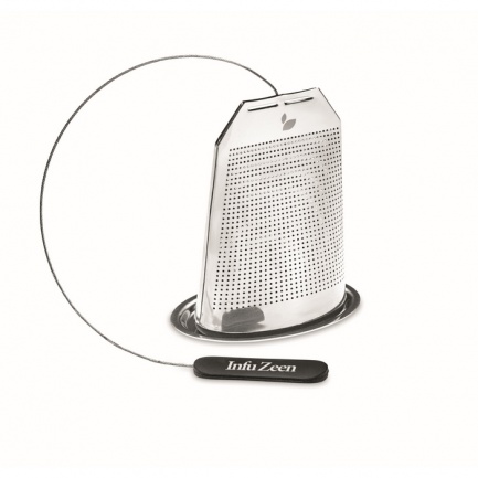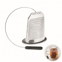 Tee-Ei/Teefilter aus Edelstahl in Optik eines Teebeutels. Inkl. Untersetzer. Griff aus Silikon.
