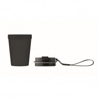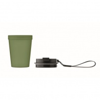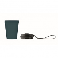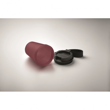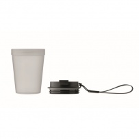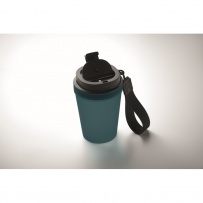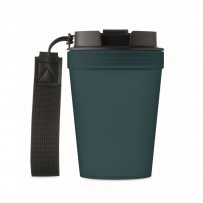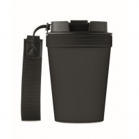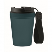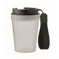 Single wall tumbler in PP, with RPET polyester strap. Leak-free. Capacity: 300 ml. As this is a single walled tumbler, heat transfer can still occur.