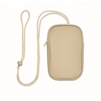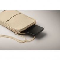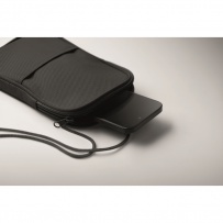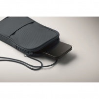 Cross body travel pouch in 600D RPET polyester and 210D RPET lining with cord strap.