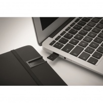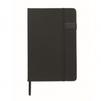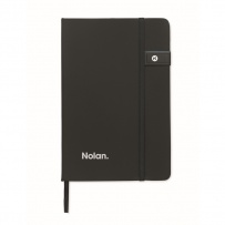 A5 notebook in hard cover made of 58% recycled polyester and 42% PU including integrated 16GB USB stick. Casebound. 160 lined recycled paper pages (80 sheets). Matching elastic closure strap and ribbon page-marker. FSC-certified | FSC MIX CREDIT, P7.1, FSC-C213206