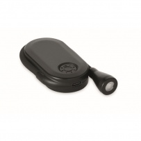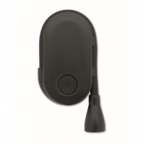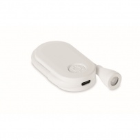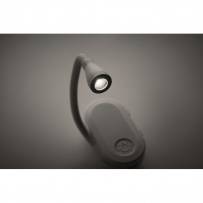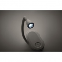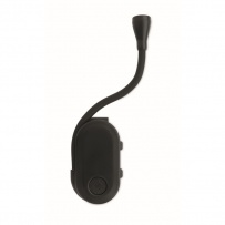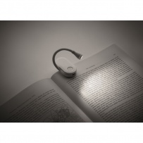 Rechargeable LED book light in ABS with flexible body and clip. Features 3 light settings, 300mAh battery.